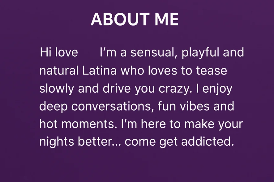 “Una mujer segura, sensual y dispuesta a jugar si tú lo estás. Te miro, te hablo, te provoco… y tú solo disfrutas. Mi cara, mi cuerpo y mi actitud están aquí para encenderte.” “A confident, sensual woman, ready to play if you are. I look at you, I talk to you, I tease you… and you just enjoy it. My face, my body, and my attitude are here to ignite you.”